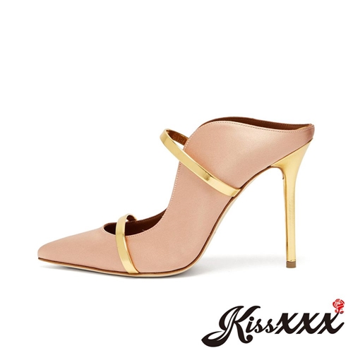 [訂製]復古尖頭撞色一字飾帶造型深口高跟拖鞋 粉 |