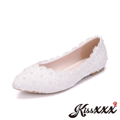 唯美珍珠蕾絲花朵尖頭低跟便鞋 白 |
