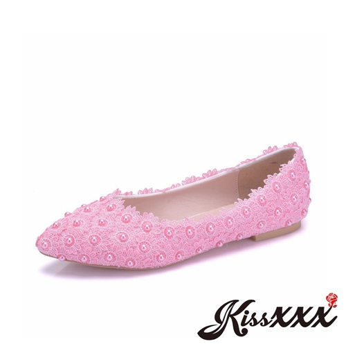 唯美珍珠蕾絲花朵尖頭低跟便鞋 粉 |