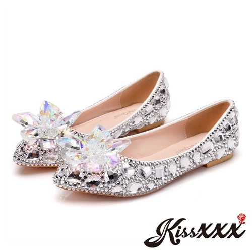 華麗美鑽寶石拼貼立體水晶花造型尖頭低跟便鞋 銀 |