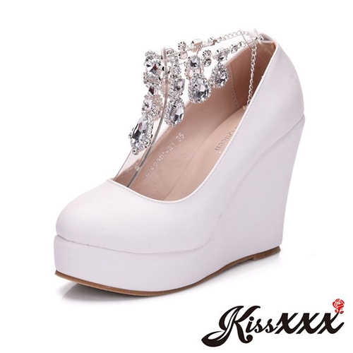小圓頭璀璨水滴墜鑽鍊楔形高跟鞋 白/紅/紫/藍/粉/金 |