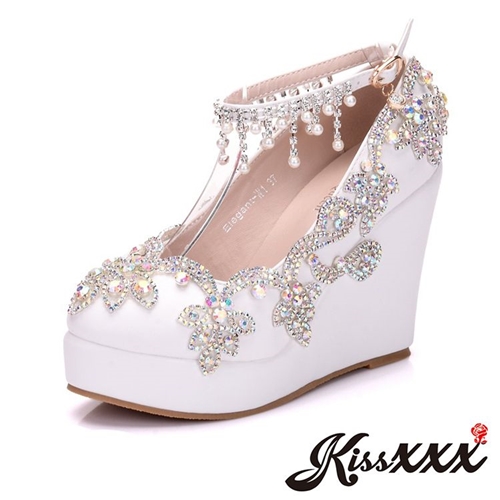 華麗璀璨宮廷風美鑽防水台珍珠墜繫帶楔形高跟鞋 白 |