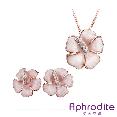 [快速出貨] 粉嫩山茶花美鑽彩釉項鍊耳環套組 玫瑰金色*愛芙晶鑽* |