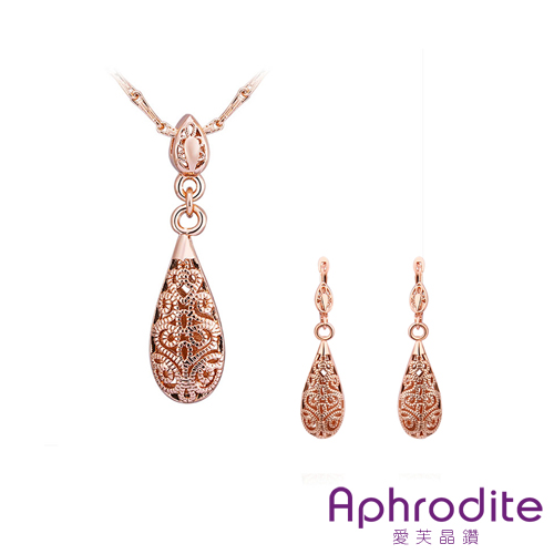[快速出貨] 復古水滴縷空刻花項鍊耳環套組 玫瑰金色*愛芙晶鑽* |