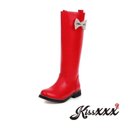 可愛蝴蝶結造型百搭低跟長筒靴 紅 |