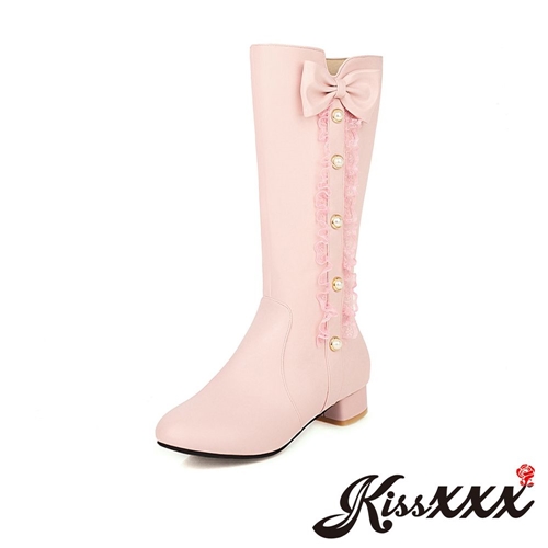 甜美公主風蕾絲花邊珍珠釦蝴蝶結造型低跟中筒靴 粉 |