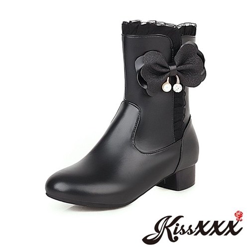 甜美公主風蕾絲花邊金蔥蝴蝶結造型低跟短靴 黑 |