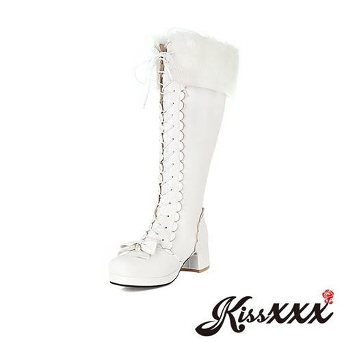 甜美蕾絲花邊毛絨靴口系帶造型粗跟長靴 白 |