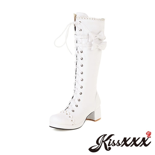 復古縷空蕾絲花邊雙蝴蝶結釦帶綁帶粗跟中筒靴 白 |