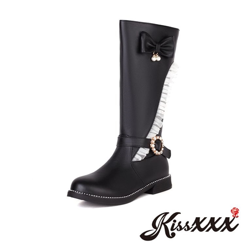 唯美蕾絲蝴蝶結搭釦造型低跟中筒靴 黑 |