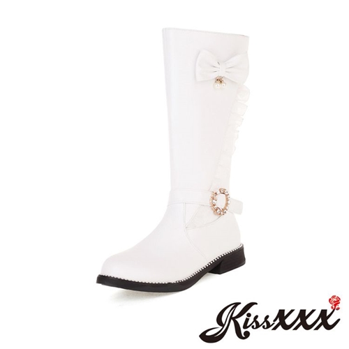 唯美蕾絲蝴蝶結搭釦造型低跟中筒靴 白 |