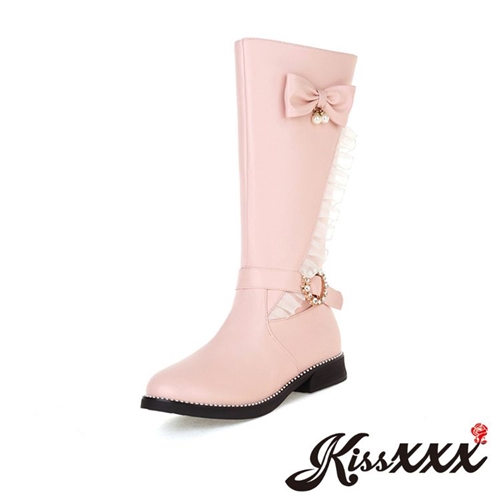 唯美蕾絲蝴蝶結搭釦造型低跟中筒靴 粉 |