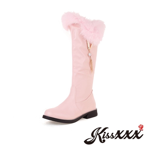 華麗絨毛靴口流蘇V釦造型低跟長靴 粉 |