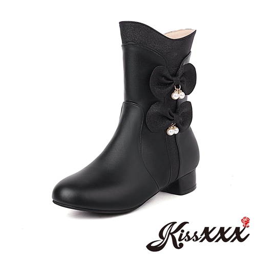 金蔥亮粉拼接雙蝴蝶結造型低跟中筒靴 黑 |
