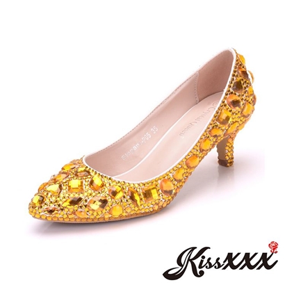 尖頭淺口不規則寶石貼鑽華麗高跟鞋 黃 |