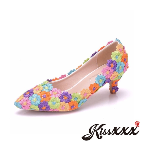 繽紛彩色刺繡花朵尖頭淺口高跟鞋 彩 |