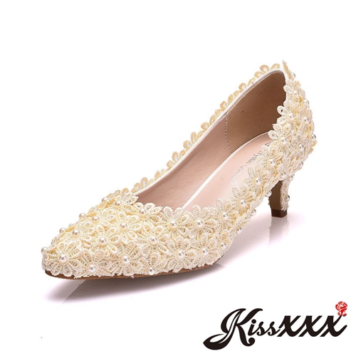 珍珠花朵刺繡唯美蕾絲尖頭淺口高跟鞋 米 |