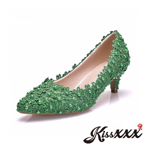 珍珠花朵刺繡唯美蕾絲尖頭淺口高跟鞋 綠 |