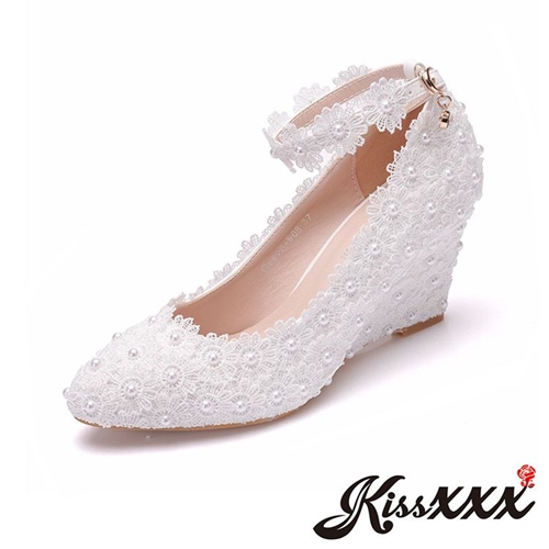 典雅唯美珍珠蕾絲花朵繫帶楔形鞋 白 |