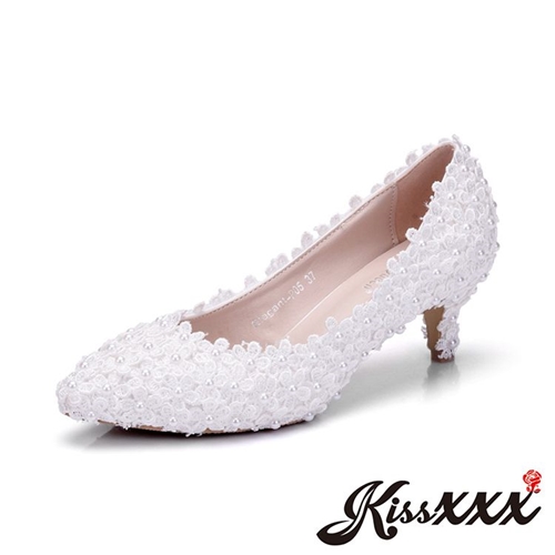 唯美珍珠花朵蕾絲小尖頭高跟鞋 白 |