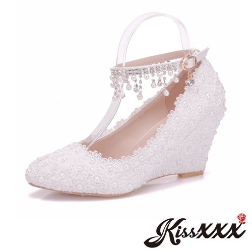 唯美珍珠花朵蕾絲流蘇珍珠繫帶楔形坡跟鞋 白 |