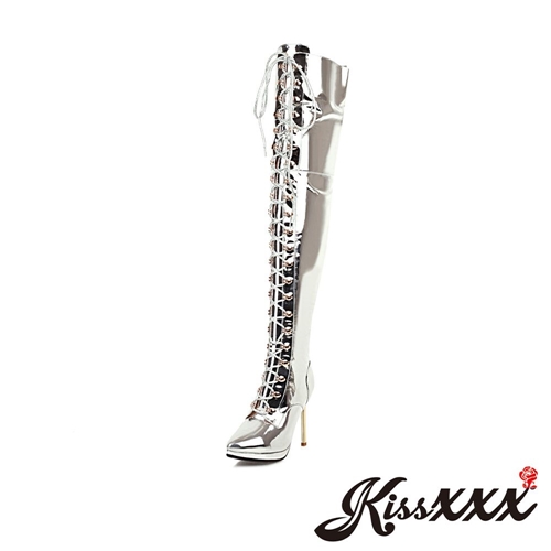 美腿效果尖頭細高跟復古綁帶性感過膝長靴 銀 |
