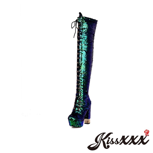 璀璨變色亮片防水台粗跟性感過膝長靴 綠 |