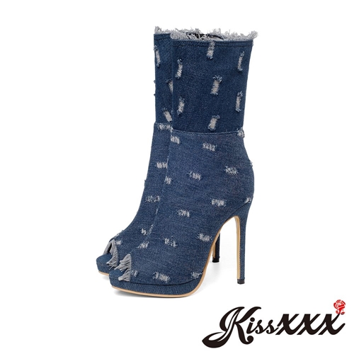 魚口露趾防水台破損風彈力牛仔高跟中筒靴 藍 |