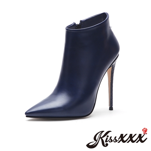 [訂製]純色質感皮紋尖頭細跟高跟短靴 深藍 |