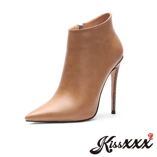 [訂製]純色質感皮紋尖頭細跟高跟短靴 卡其 |