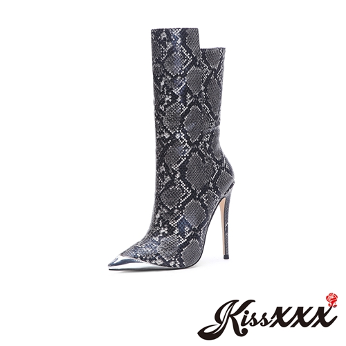 [訂製]野性蛇紋拼接金屬皮革尖頭性感細跟寬筒高跟中筒靴 灰 |