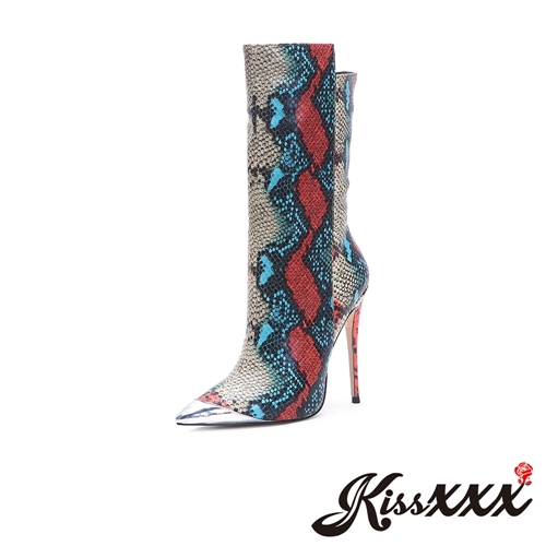 [訂製]野性蛇紋拼接金屬皮革尖頭性感細跟寬筒高跟中筒靴 拼色 |