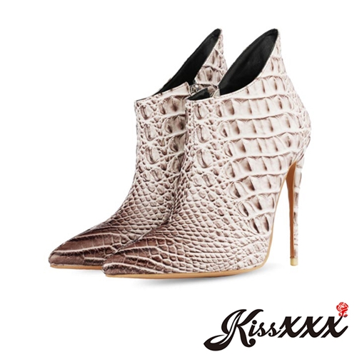 [訂製]時尚尖頭美腿效果設計款擦色立體鱷魚皮紋高跟踝靴 米 |