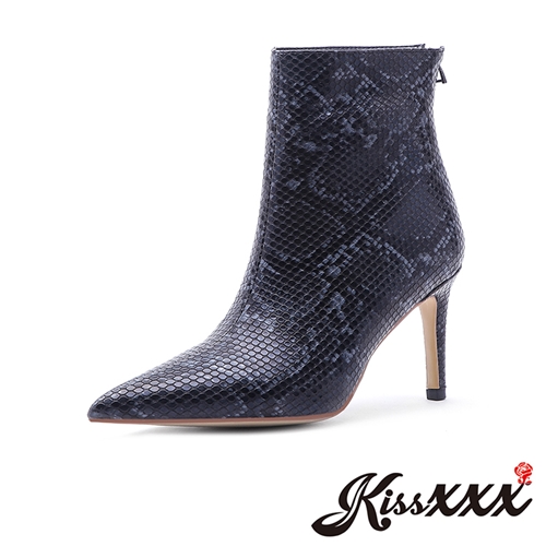 [訂製]個性尖頭野性蛇紋皮面造型高跟短靴 黑 |