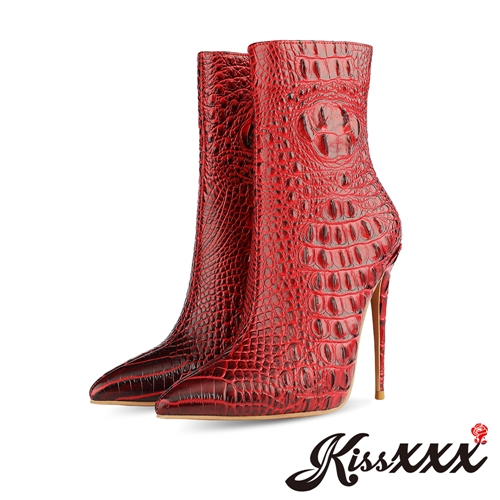 [訂製]美腿效果時尚立體鱷魚皮紋尖頭高跟短靴 紅 |