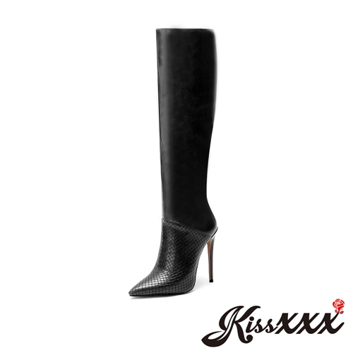 [訂製]時尚編織拼接尖頭高跟長靴 黑 |