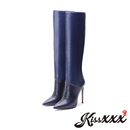 [訂製]時尚編織拼接尖頭高跟長靴 藍 |