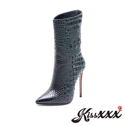 [訂製]時尚復古質感立體鱷魚皮紋高跟直筒短靴 墨綠 |