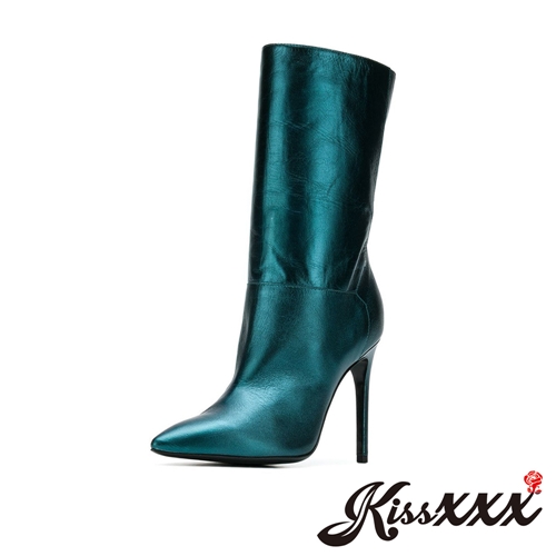 [訂製]經典純色素面拼接尖頭高跟中筒靴 綠 |