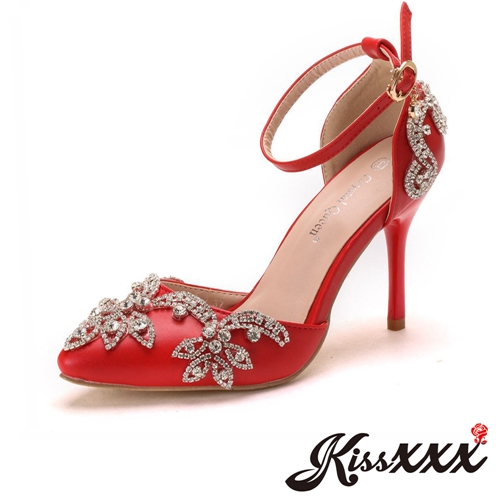 [訂製]華美璀璨花鑽墜飾尖頭高跟涼鞋 紅 |