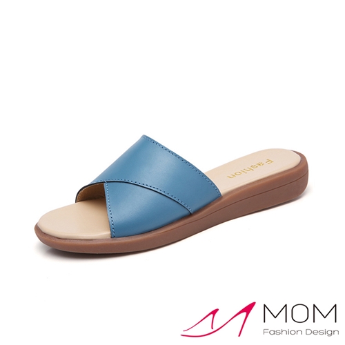 真皮V口交錯造型時尚舒適平底拖鞋 藍 |