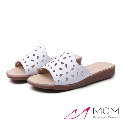 真皮水滴縷空花形波浪鞋口舒適平底拖鞋 白 |