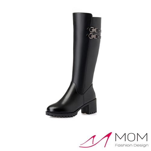真皮流行雙釦飾保暖絨裡個性粗跟長靴 黑 |