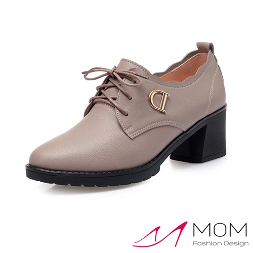 真皮優雅花邊鞋口D字金屬裝飾造型粗跟牛津鞋 卡其 |