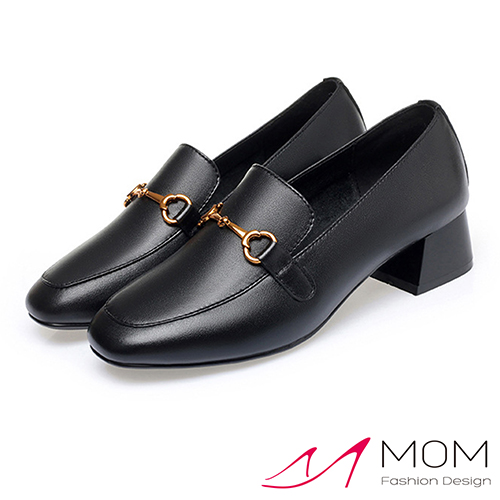 真皮馬銜釦飾小方頭粗跟樂福鞋 黑 |