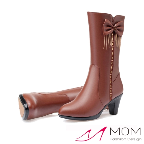 [快速出貨] 真皮質感牛皮甜美流蘇蝴蝶結高跟中筒靴 棕*MOM* |