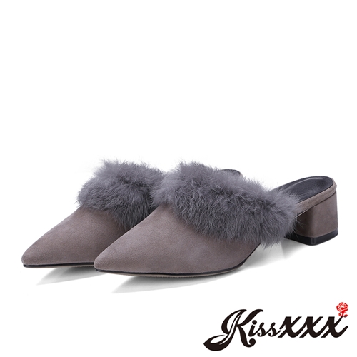 [快速出貨] 真皮小尖頭兔毛絨邊飾粗跟穆勒鞋 拖鞋 灰*KISSXXX* |