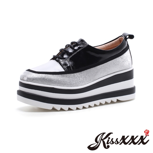[快速出貨] 全真皮方頭拼接撞色綁帶厚底鬆糕休閒鞋 黑*KISSXXX* |
