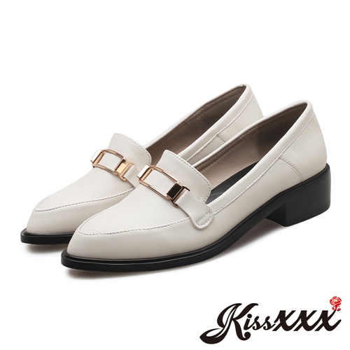 [快速出貨] 優雅小尖頭縷空方塊金屬飾件粗跟淑女鞋 白*KISSXXX* |