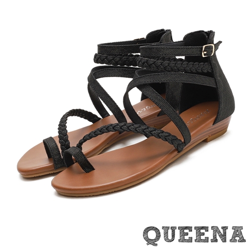 [快速出貨] 指環編織繞帶造型時尚低跟羅馬涼鞋 黑*QUEENA* |